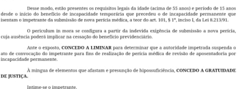 Através dos direcionamentos dos nossos canais de comunicação, ele entrou com um mandado de segurança junto à justiça federal e conseguiu decisão favorável do Juiz, cedendo liminar para que ele não precisasse comparecer a revisão, veja abaixo: